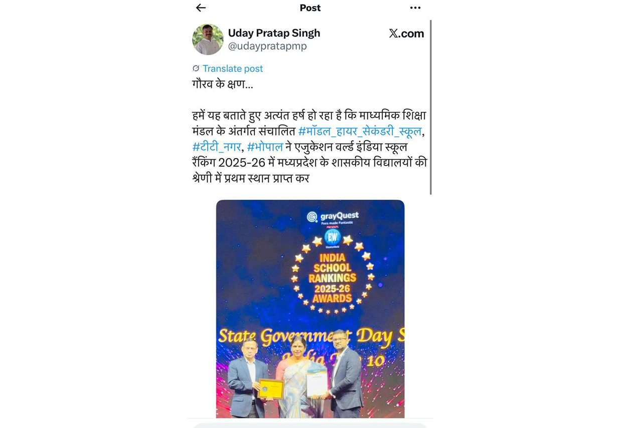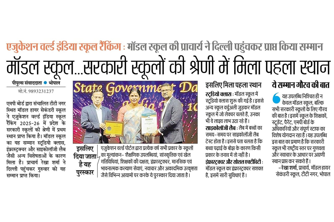 Model Higher Secondary School, one of the most prestigious Secondary educational institutions of Madhya Pradesh was established by M.P. Government in the year 1960 at Tatya Tope Nagar, Bhopal. The institution was started as an educational laboratory for comprehensive development of the students of the capital city of Bhopal.